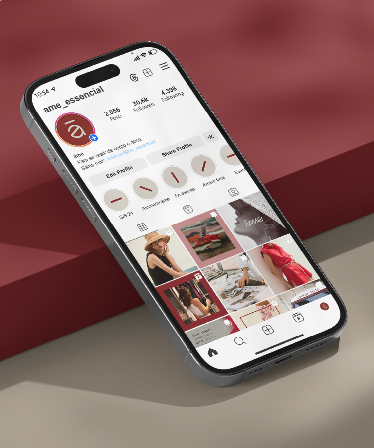 “O universo gráfico da marca foi inspirado na ideia de espelho, de se reconhecer tanto no corpo físico quanto no âmbito cognitivo. Dessa forma, o desenho tipográfico do logotipo se baseia na simetria e no contraste das formas circulares e diagonais. Reforçando o conceito, a linguagem conta com molduras que se contrapõem a fotografias, padronagens proprietárias e uma paleta cromática repleta de tons avermelhados – statements visuais para marcar com propriedade o novo posicionamento da âme. “